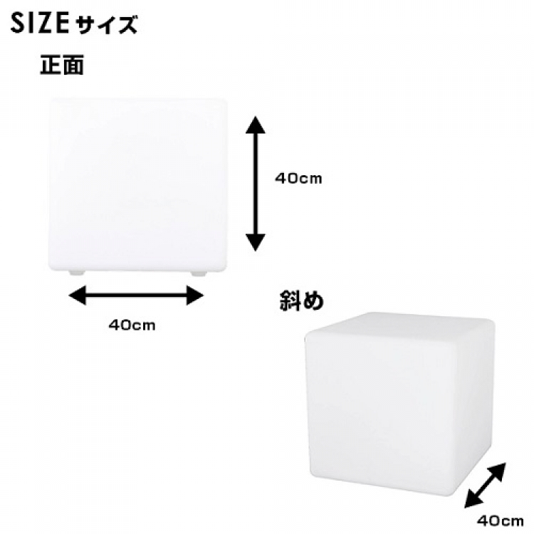 LEDスツール 品番:C-810CODE:8101054レンタル料:6000サイズ:W400 x D400 x H400商品仕様・カラー:素材/ポリエチレン ABS樹脂 発行色/全16色 光り方/全5種類 ※リモコン付き 商品のお問い合わせ