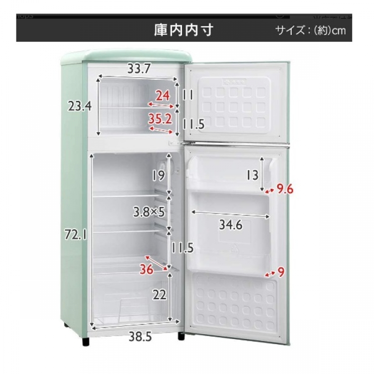 レトロ風冷蔵庫(114L)ライトグリーン 品番:WL-1178CODE:11782011レンタル料:14000サイズ:W480 x D530 x H1235商品仕様・カラー:容量/114L(冷蔵庫:87L/冷凍庫:27L) 重量/約29.5kg下段の取っ手は破損しております。 見た目に問題はございませんが、引っ張ると外れてしまいます。 商品のお問い合わせ