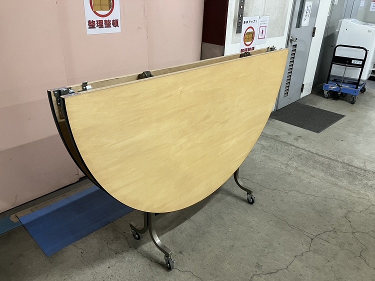 宴会用テーブル 品番:T-129B-01CODE:1292001レンタル料:13000サイズ:φ1800 x H700商品仕様・カラー:天板【表面材】/シナベニア、CL塗装 天板【エッジ】/ソフトエッジ巻(黒)キャスター/ストッパー4個付 天板折りたたみ式 商品のお問い合わせ
