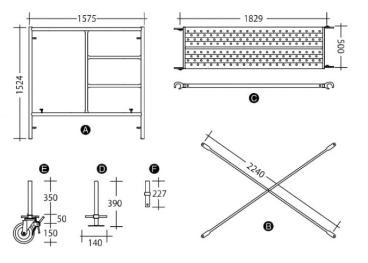 (A)枠 (B)ブレース (C)アンチ (D)ジャッキベース (E)キャスターベース (F)ジョイントピン (G)手すり (H)アウトリガー