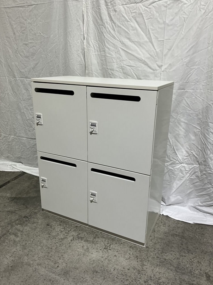 メールロッカー(4人用) 品番:O-714CODE:7142032レンタル料:30000サイズ:W900 x D450 x H1030 内寸:W415 x D410 x H468商品仕様・カラー:スチール(ホワイト) ダイヤル錠東京営業所の在庫になります。 商品のお問い合わせ