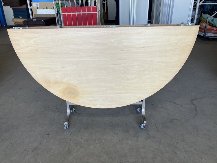 宴会用テーブル 品番:T-129B-01CODE:1292001レンタル料:13000サイズ:φ1800 x H700商品仕様・カラー:天板【表面材】/シナベニア、CL塗装 天板【エッジ】/ソフトエッジ巻(黒)キャスター/ストッパー4個付 天板折りたたみ式 商品のお問い合わせ